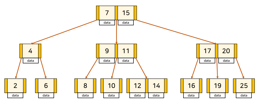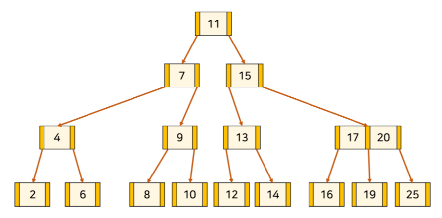 특징 1. 하나의 노드에는 2개 이상의 키가 존재할 수 있으며 항상 정렬된 상태로 저장된다.
