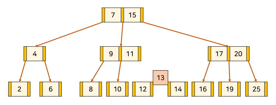 3. 해당 노드의 중간 값인 13이 부모 노드와 합쳐지게 되고 부모 노드가 가지는 키(9, 11) 중에서 11보다 큰 값이기 때문에 오른쪽에 위치하게 된다. 자식 노드들도 키 값에 따라 각각 분할하게 된다.