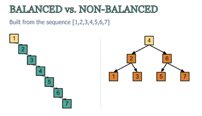 - 균형 잡히지 않은 이진 탐색 트리의 경우 시간 복잡도가 O(N)