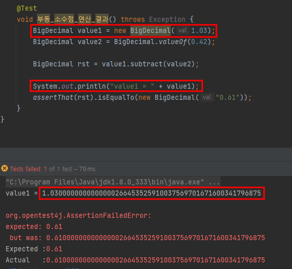 부동 소수점 방식인 double로 연산을 수행하게 되면 정확한 결과값을 얻을 수 없다.