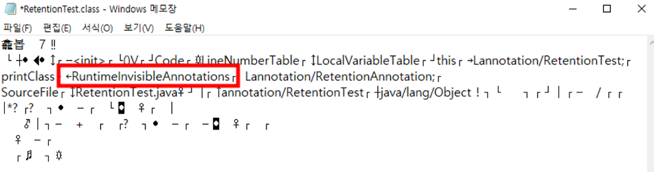 유지정책이 CLASS인 경우에 클래스 파일에도 애너테이션이 존재한다고 정의되어있다. 따라서 해당 클래스 파일에도 애너테이션이 적용되어 있는 것을 알 수 있다.
