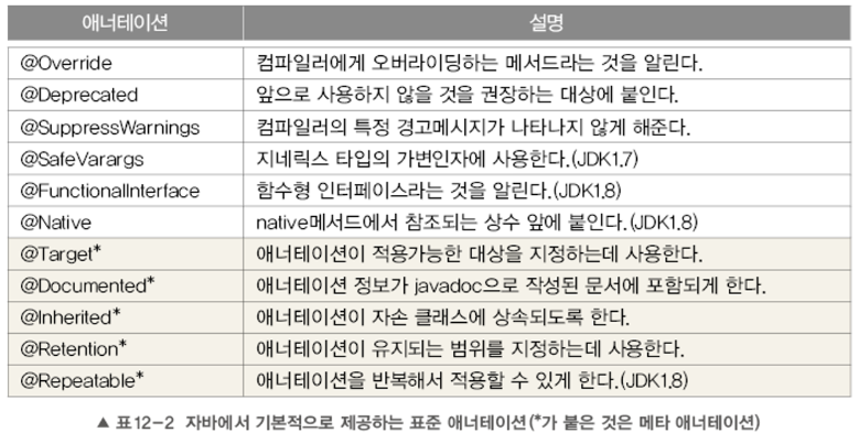 | SOURCE | - 애너테이션이 소스 파일에만 존재한다. 이 말은 사실상 주석으로 사용한다는 것을 의미한다. - 컴파일러가 컴파일할때 해당 애너테이션의 메모리를 버리게 된다. |