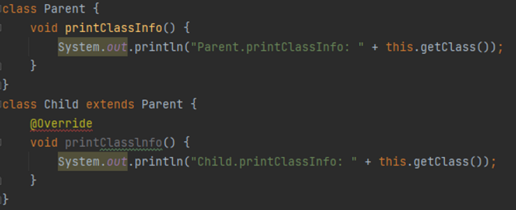 메서드 앞에만 붙일 수 있는 애너테이션으로 부모 클래스의 메서드를 오버라이딩한다는 것을 컴파일러에게 알려주는 역할을 한다. 만약, 오버라이딩 시에 부모 클래스의 메서드를 잘못 쓰게 되면 컴파일러가 잘못된 것임을 알려준다.