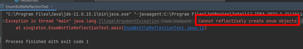 따라서 열거형을 인스턴스화할 때 IllegalArgumentException과 함께 열거형 객체를 생성할 수 없다는 예외 메시지를 받게 된다.