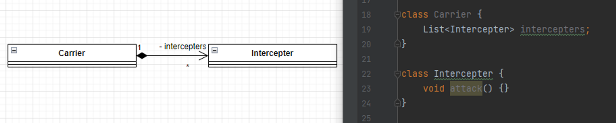 합성 관계는 스타크래프트 캐리어의 인터셉터로 예시를 들 수 있다.