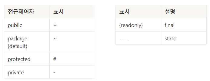 접근 제어자와 필드 속성에 따라 다음과 같이 표현할 수 있다.