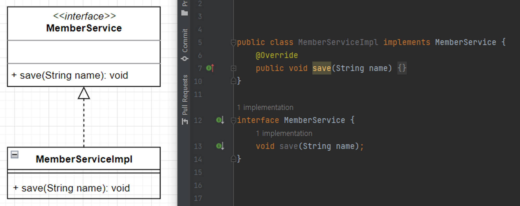 실체화(Realization) 관계는 interface에 명세(정의)만 되어 있는 메서드를 오버라이딩하여 실제 기능으로 구현하는 것을 나타낸 관계로 인터페이스와 구현 클래스 사이의 실체화(Realize) 관계는 점선으로 연결하고 인터페이스 쪽에 비어있는 삼각형 화살표로 연결하여 표현한다.