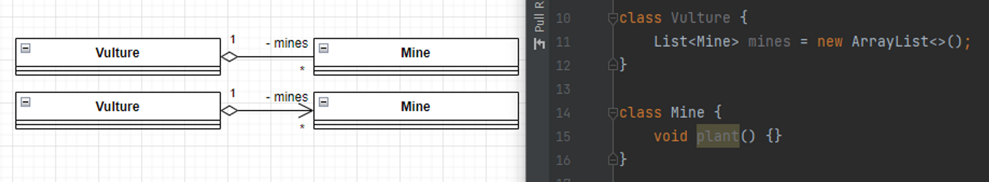 집합 관계는 연관 관계의 집합 관계를 나타내는 것으로 Collection이나 Array를 이용하는 관계로 아래 이미지에서 전체(Whole)는 Vulture이게 되고, 부분(Part)은 Mine이 된다.