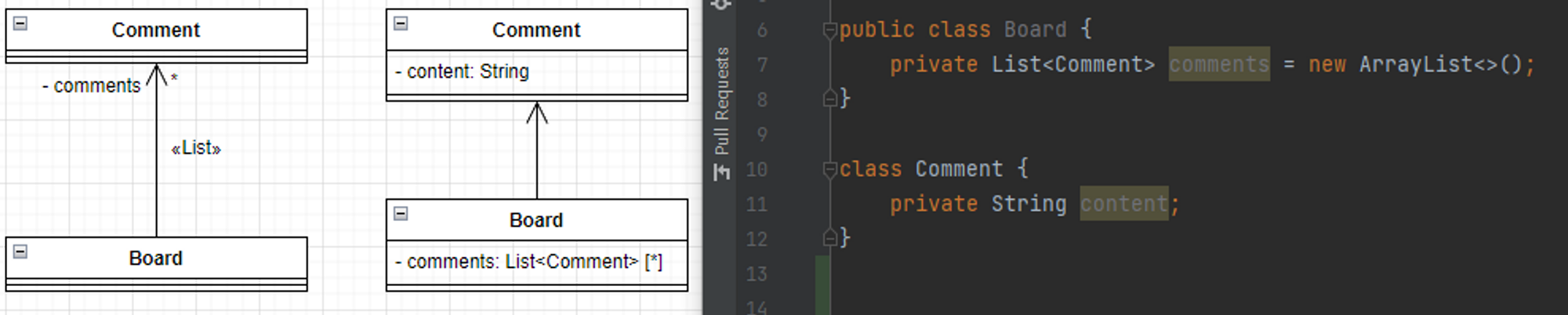 만약 아래 이미지처럼 실선으로만 이어져있다면 Board가 Comment를 참조할 수도, Comment가 Board를 참조할 수도, 둘 다 참조할 수도 있음을 의미한다.