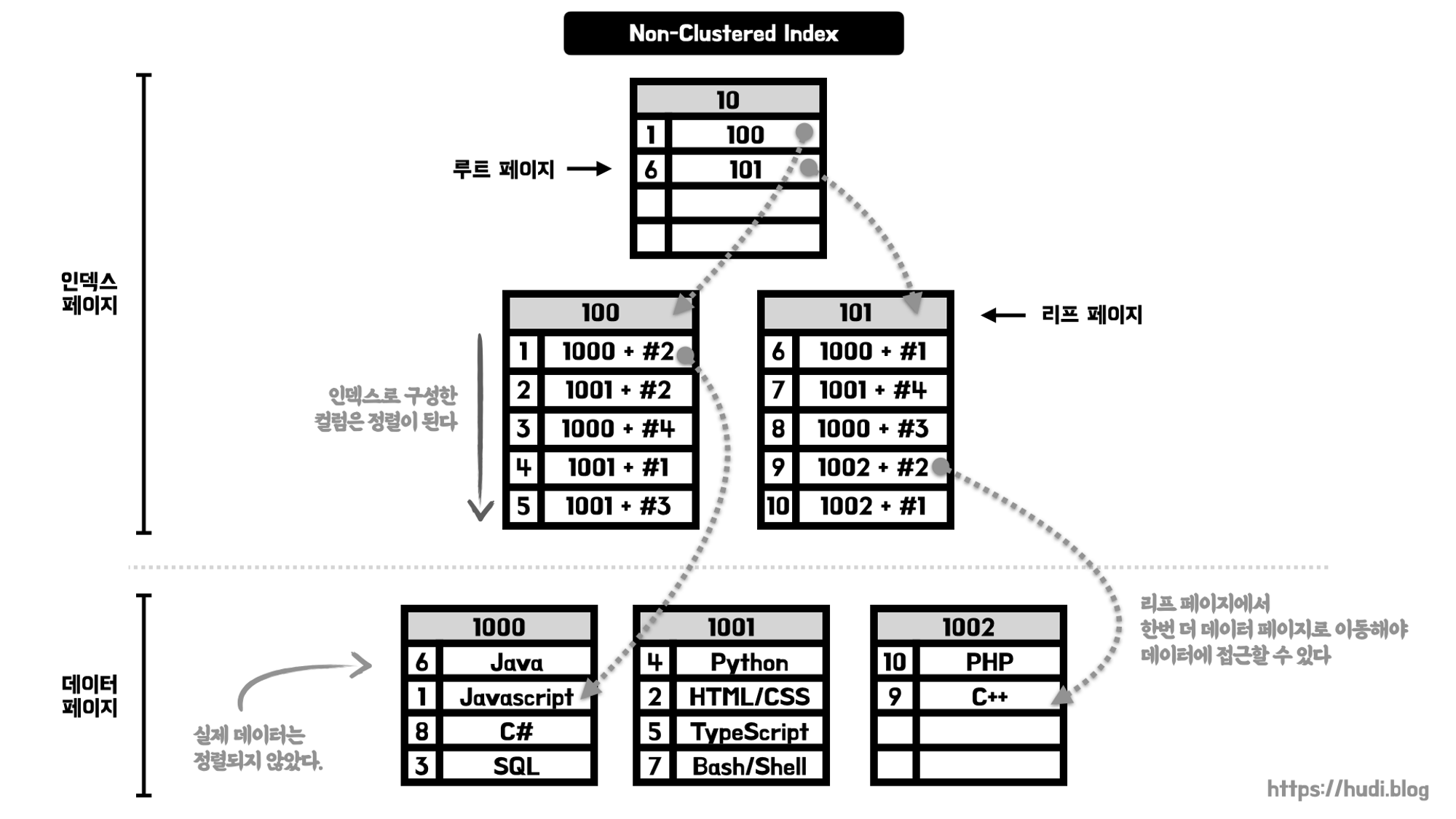 앞서 이야기한 것처럼 세컨더리 인덱스는 클러스터형 인덱스와 달리 인덱스 페이지와 데이터 페이지가 구분되어 있다.