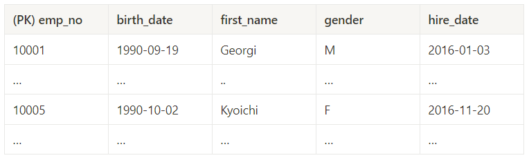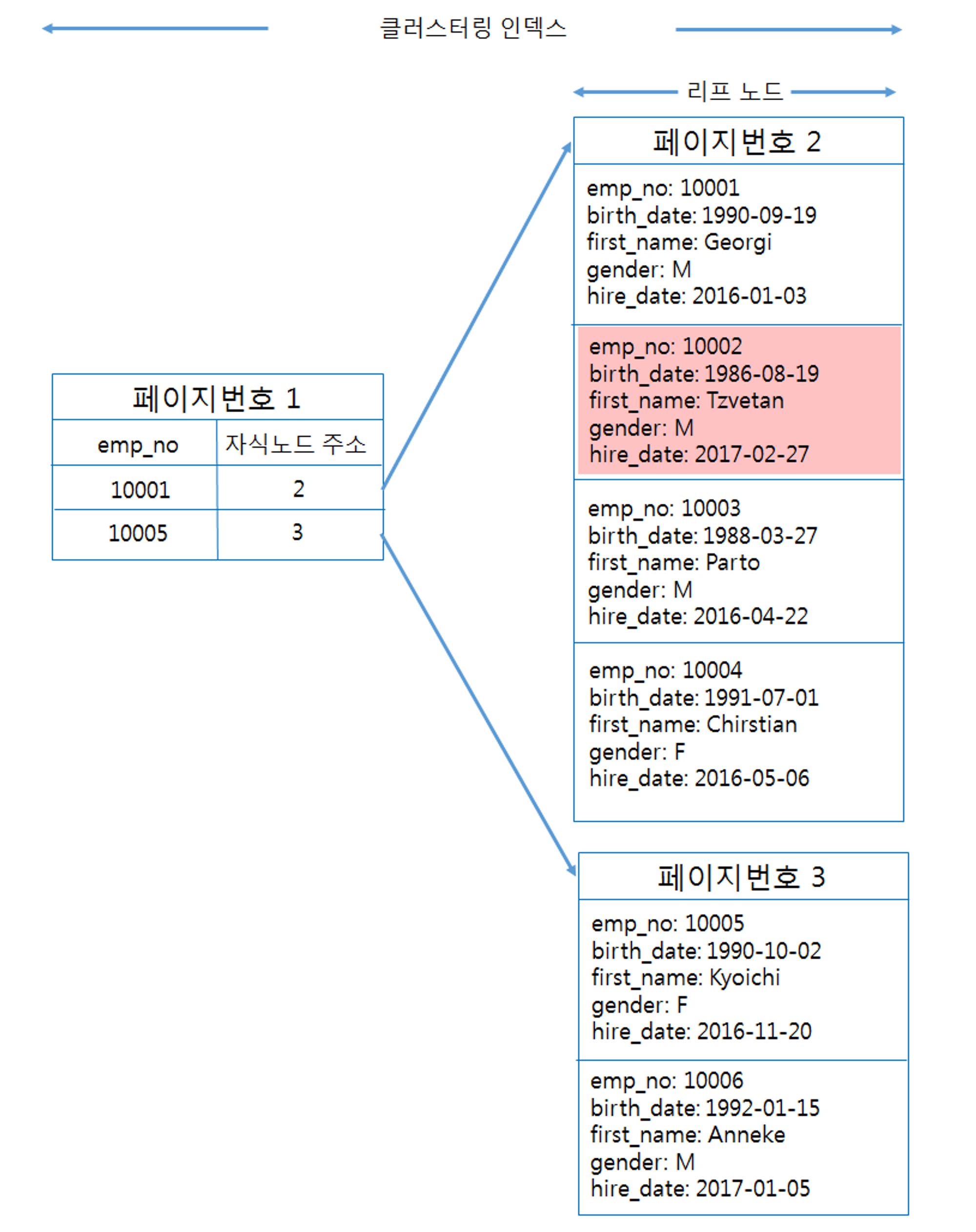 emp_no 컬럼이 프라이머리 키로 지정된 클러스터형 테이블은 다음과 같은 구조가 된다.