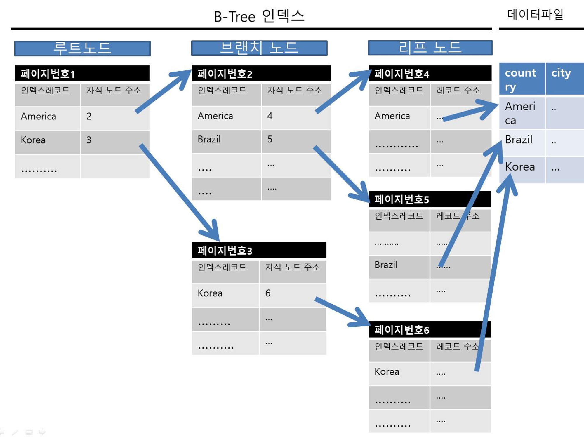 - 루트 노드: 키로 프라이머리 키를 가지고, 값으로 페이지 번호를 가진다